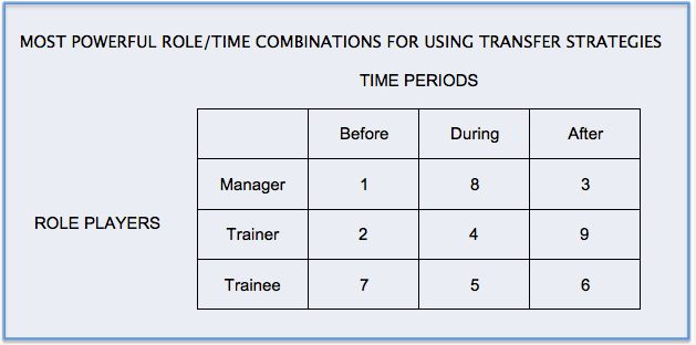 Unless you are completely new to the concept of training transfer (and if you are, I realize this is a very crude explanation), it’s probably no secret that the manager plays a key role in whether or not a participant is able to apply the skills and knowledge s/he acquires in a training session. As you can see from the grid above, the #1 and #3 most important components are tied to manager support.